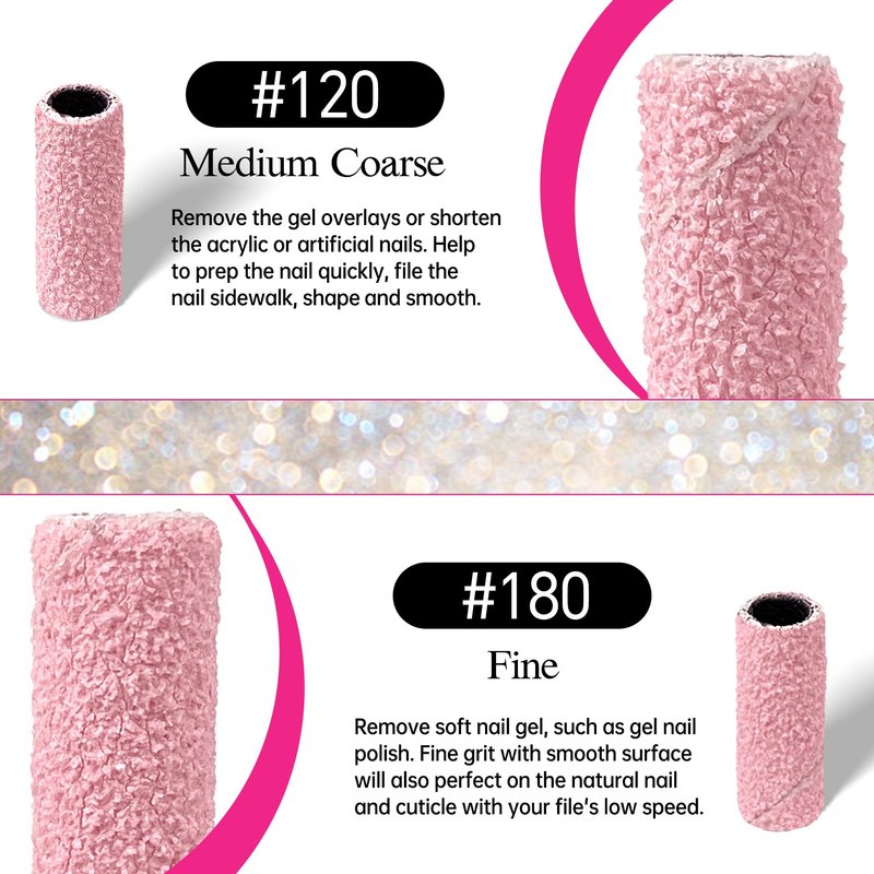 - Various Grit Options - SALVMARY offer different grit for choice. #120 Grit help to prep the nails quickly, file the nail sidewalk, shape and smooth. #180 Grit remove soft nail gel, such as gel nail polish. Fine grit with smooth surface will also perfect on the natural nail and cuticle with your file's low speed.