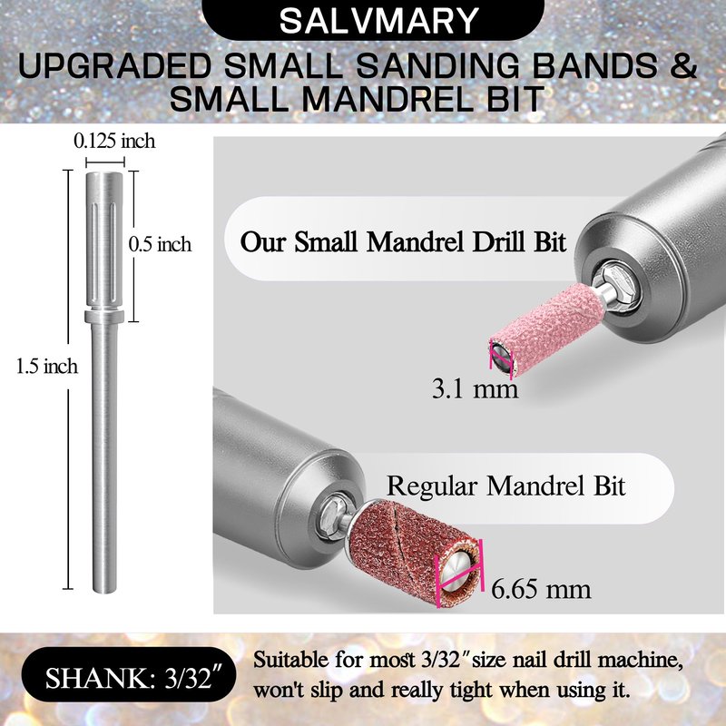 - SALVMARY Upgrade 3MM Small Nail Sanding Bands with 3.1MM Mandrel Bit Set - Come with 50PCS Pink 120 Grit 3MM Small Sanding Band and 1PCS 3.1MM Small Mandrel Bit.| Mandrel Shank Size: 3/32".