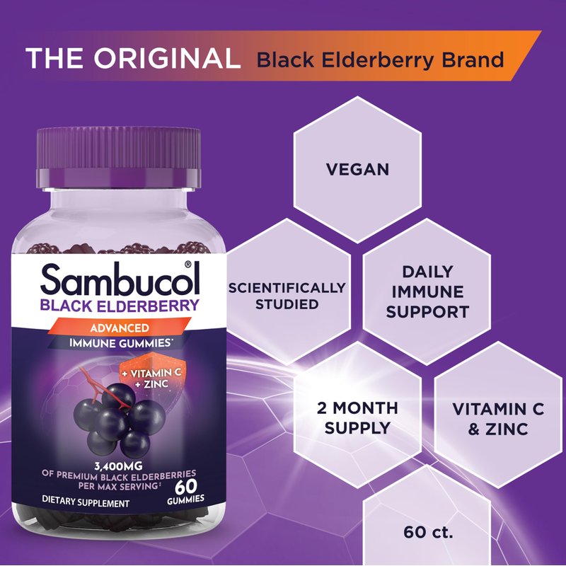 Sambucol Black Elderberry Gummies - Elderberry with Zinc and Vitamin C for Adults, Sambucus Elderberry Gummies, Immune Support Gummies - 60 Count