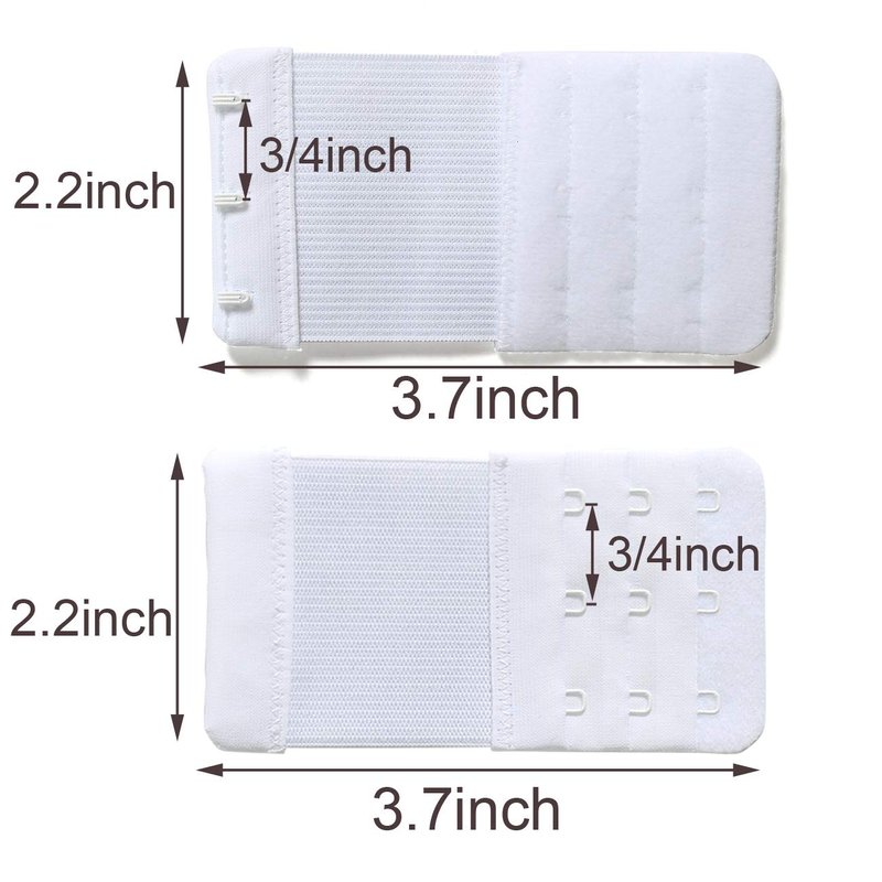 - {Model: bra extender 2 hook 1/2inch spacing. SIZE (L x W)}: 3.8 x 1.18 inch, 1/2 inch spacing between hook centers; {Model: bra extender 3 hook 3/4 inch spacing. SIZE (L x W)}: 3.7 x 2.2 inch, 3/4 inch spacing between hook centers.
