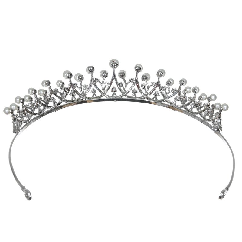 Elegant Princess CZ Crystal Platinum Plated Pearl Bridal Tiara Crown T1265