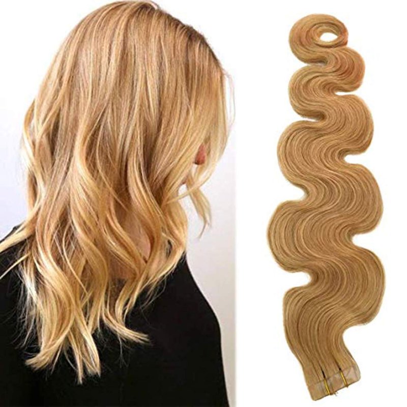 Samrtinnov Long Wave #27 Strawberry Blonde Tape in Hair Extensions Culry 70grams 20pcs Skin Weft Body Wave Seamless Tape in Extensions Remy Human Hair