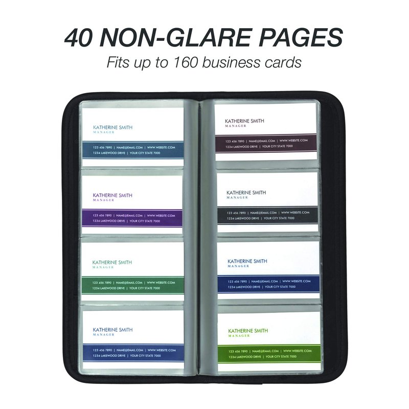- EASY TO FIND & READ – Securely fit business or credit cards in 160 individual slots distributed over 40 different 4-high non-glare plastic pages that allow clear card readability – One additional slot inside for other frequently used cards/notes