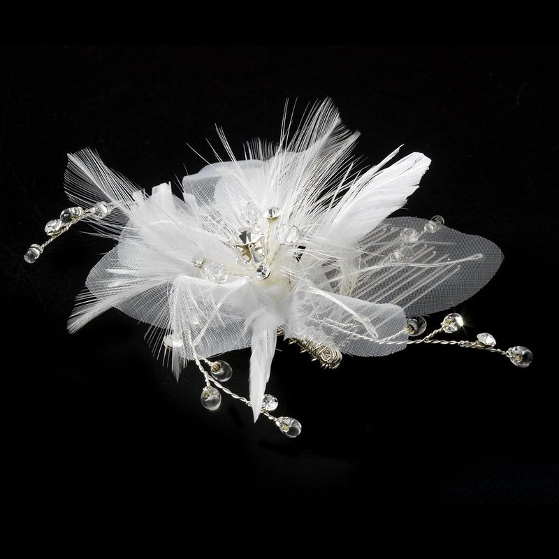 Add a touch of sweetness to your wedding day with this lovely feather, fabric, and rhinestone floral comb. The beaded vine catches the light behind the translucent flower, making this piece the perfect finishing touch to your bridal hairstyle. Size: Adornment measures 3.5" wide x 4" tall