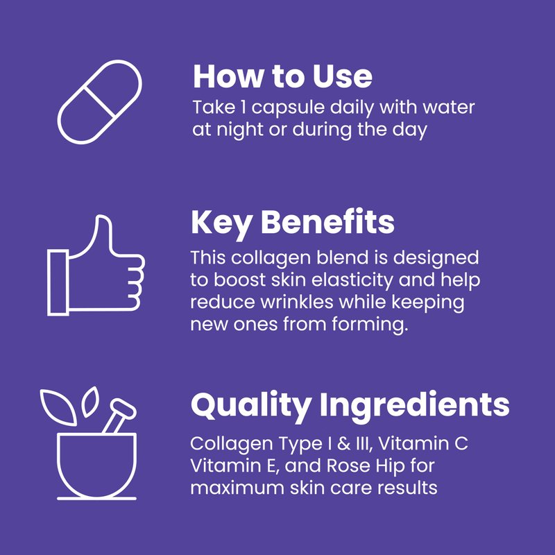 - Collagen Wrinkle Formula Beauty Supplement: Specially designed to tighten skin, reducing face wrinkles, dark circles under eye, forehead wrinkles and wrinkles over time. Our collagen supplement contains a blend of hydrolyzed collagen peptides powder Type I, III from bovine, Vitamin C, Vitamin E, and Rose Hips in small gelatin capsule form.