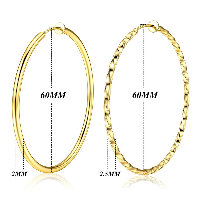 - Size: 4 Sizes non-pierced hoop earrings can be choose from, there are medium 30mm (1.2 inch) hoop earrings; large 40mm (1.5 inch) hoop earrings; xl 50mm (1.9 inch) hoop earrings and xxl 60mm (2.3 inch) hoop earrings.