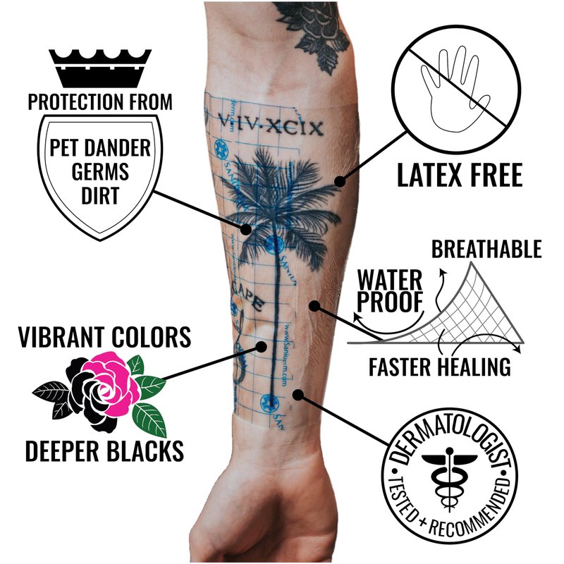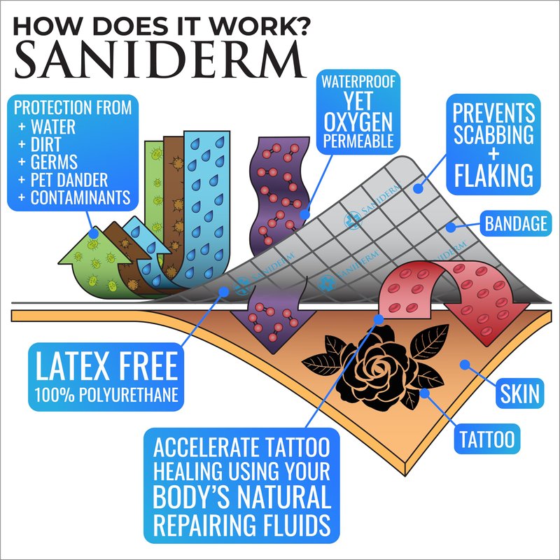 - YOUR TATTOO IS COVERED AND PROTECTED: During those critical days after getting your tattoo water, dirt, and germs can irritate, lead to infection, and damage your ink. Using Saniderm helps ensure that your tattoo is protected from foreign contaminants. Saniderm bandages are also 100% breathable to give your tattoo the oxygen it needs to heal properly.