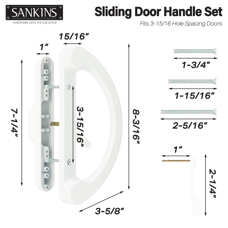 - [GREAT VALUE NON-KEYED PATIO DOOR HANDLE SET] SANKINS replacement patio door handle set comes with 1 interior handle, 1 exterior non-keyed non-locking pull, a thumb latch lever and 6 screws with 3 different lengths to fit various thickness doors (2x 1-3/4” Screws, 2x 1-15/16” Screws, and 2x 2-5/16”).