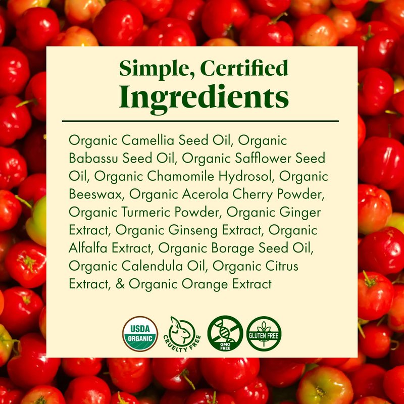 USDA ORGANIC <> Beneficial Acerola Cherry Vitamin C Cream <> For All Skin Types <> Assists in Organically Restoring and Rejuvenating Facial Skin <> 1.1 oz (33 ml)