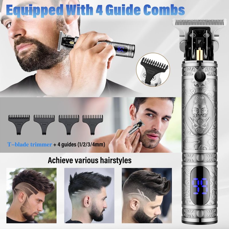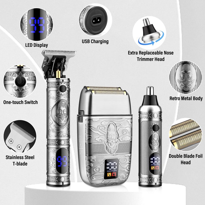 PROFESSIONAL HAIR CLIPPER SET Hair Trimmer & Beard Trimmer & Nose Hair Trimmer for Men Specifications: Color: Silver Material:All Metal Features:Hair clippers kit using retro punk metal body design,cordless t-blade rechargeable, LED display, sharp blades, strong power. Use:Hair clipper grooming kit for men.This professional trimmer for men makes it easy to trim hair, beard, sideburns, face, and body hair.The increased shaving area of the dual foil razor for men better accommodates difficult to shave areas such as the chin and throat.