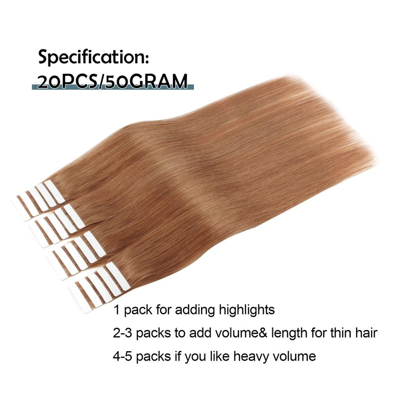 - 【Tape in Extensions Specification】: 12 Inch each pack weighs 30 grams and 14-22 Inch each pack weighs 50 grams, 20 pcs per pack. If you want your hair to look thicker, we recommend you use 3-4 packs.