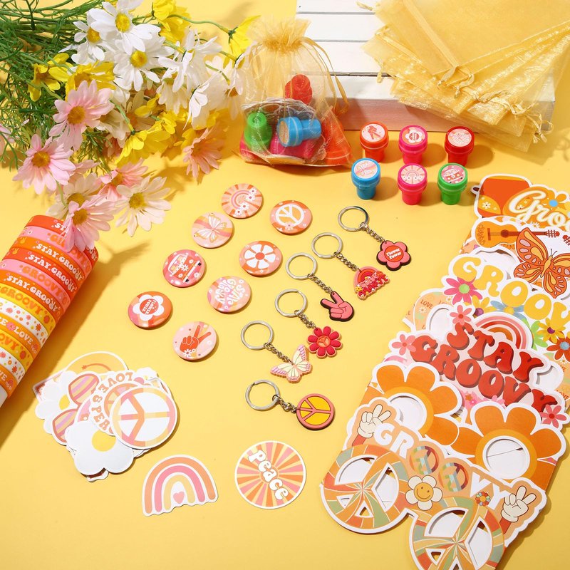 - Groovy Hippie Party Favors Set: the package includes 122 pieces retro hippie party favors which is 12 hippie silicone bracelets, 12 groovy hippie key chains, 12 hippie badges, 12 groovy hippie glasses, 12 hippie stampers, 12 organza bags and 50 groovy hippie stickers; Both adults, boys and girls will like them