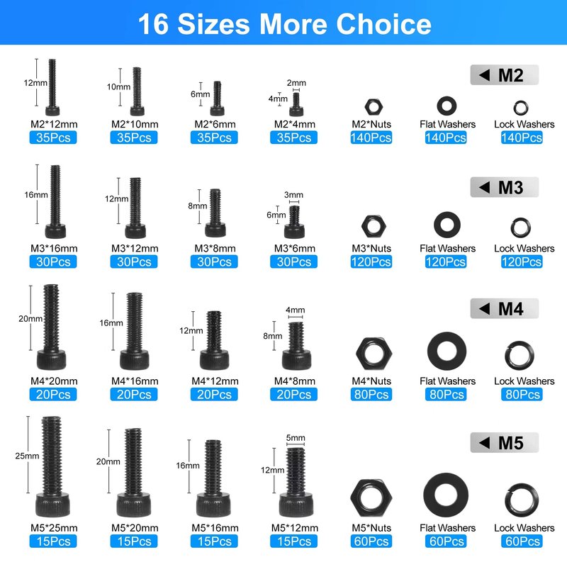 - 【1600pcs 16 Standard Size】: Various M2 M3 M4 M5 screws and bolts with lock&flat washers, total 16 sizes : M2 screws: bolt length: 4mm,6mm,10mm,12mm, M3 screws: bolt length: 6mm,8mm,12mm,16mm, M4 screws: bolt length: 8mm,12mm,16mm,20mm, M5 screws: bolt length:12mm,16mm,20mm,25mm, 1600pcs in total, meet all demands. 4 hex wrenches customized for each size are provided in the kit to make the screws easier to use.