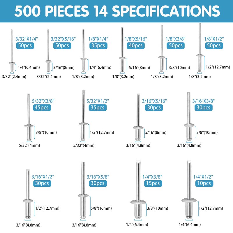 - 【500pcs 14 Standard Sizes】This pop rivets assortment kit includes 500 pieces 14 most used sizes for your various needs. Including 50pcs 3/32” x 1/4”, 50pcs 3/32” x 5/16”, 35pcs 1/8” x 1/4”, 40pcs 1/8” x 5/16”, 50pcs 1/8” x 3/8”, 50pcs 1/8” x 1/2”, 45pcs 5/32” x 3/8”, 35pcs 5/32” x 1/2”, 30pcs 3/16” x 5/16”, 30pcs 3/16” x 3/8”, 30pcs 3/16” x 1/2”, 30pcs 3/16” x 5/8”, 15pcs 1/4” x 3/8”, 10pcs 1/4” x 1/2”, total 50pcs.
