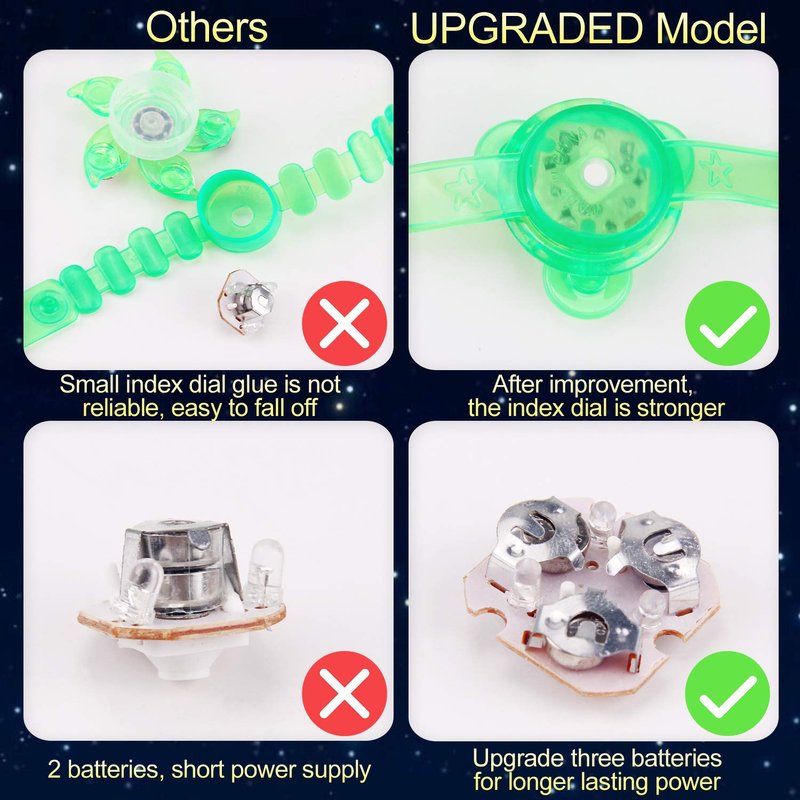 Product Description: Our Satkago design philosophy is dedicated to providing more fun toys for kids and giving them a wonderful childhood. What Occasions can be used to? 1.This light up bracelet is perfect for Easter gift, birthday party, Christmas party, dance parties, camping, New Year's Eve party, neighborhood block party or preschool end of the year party. 2. It can be used as birthday party favors for kids or giveaways, unique gifts for kids, boys girls party favors, goodie bag stuffers, carnival prizes, classroom rewards, kids prizes and so on. 3. Kids love anything with lights and it's also great for training concentration, creativity and stress relief.