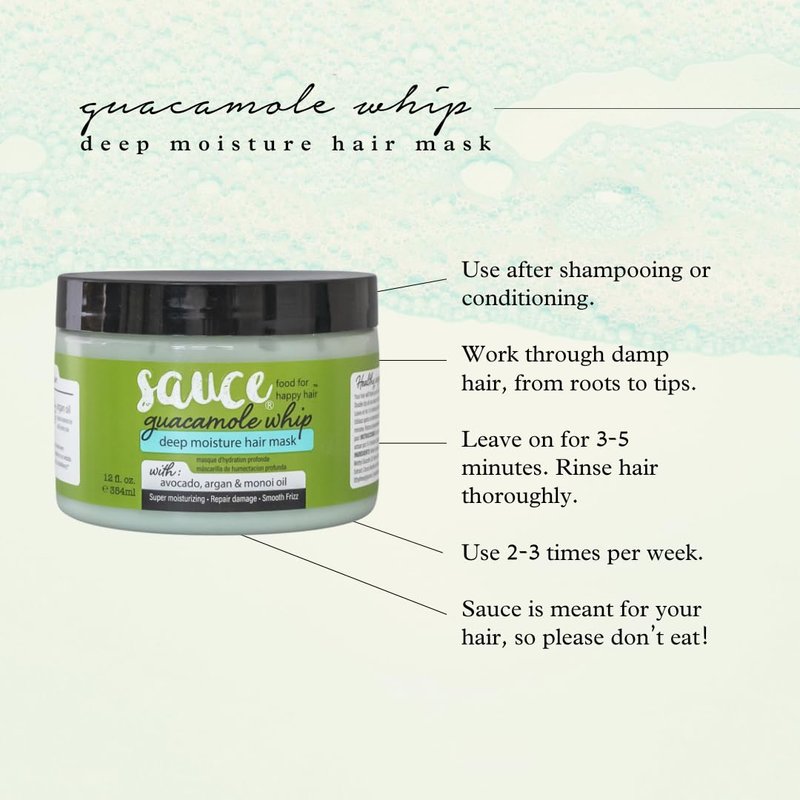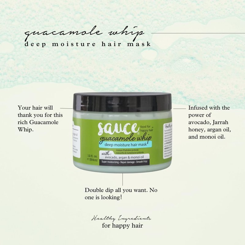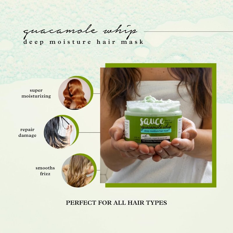• Sauce Beauty Guacamole Hair Mask: At Sauce Beauty, we're inspired by how real ingredients can nourish not just your body, but also your hair; Our iconic avocado hair mask includes ingredients like argan oil & honey to focus on hair repair & treatment