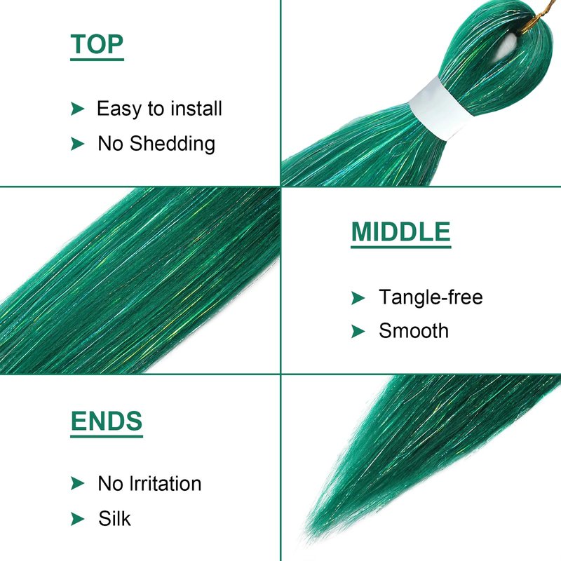 Savasana Green with Tinsel Pre stretched Braiding Hair, 26 Inches Kanekalon Box Braids Hair Extensions, 3 Packs Yaki Texture Braiding Hair Pre stretched
