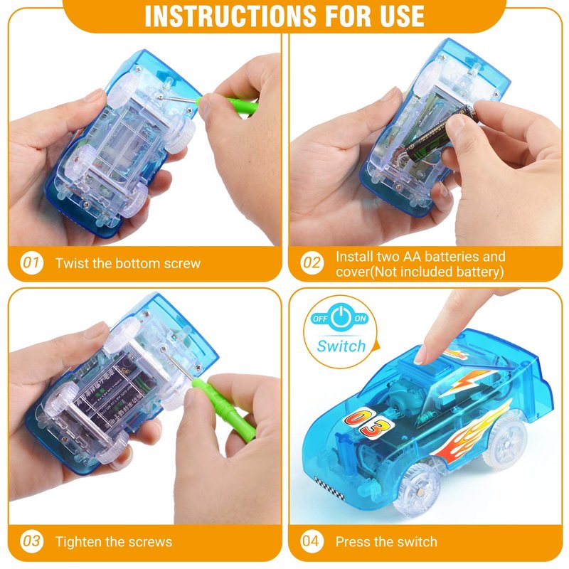- 【Safe and Easy to Play 】- These track cars replacement are made by environmentally friendly non-toxic plastic materials, which are safe for children. For these tracks cars, the switch are at the bottom. The child can easily use it independently and have fun! Each Toy Car requires 2 AA battery (NOT included).We suggest you to purchase the rechargeable battery to save battery cost.