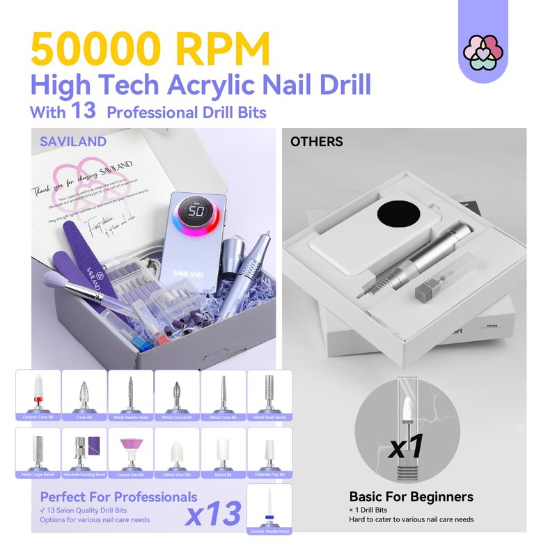SAVILAND 50000RPM Nail Drill for Acrylic: 2024 Pro High Tech Fast Removal Electric Nails Drill Kit 6000mAh Rechargeable Machine Professional Drill Bit Nail File Buffer Tools Salon Manicure Pedicure