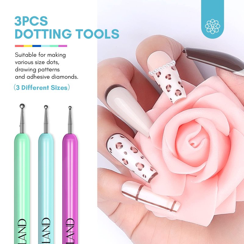 A: Our nail art kit has a variety of shapes of nail art brushes for drawing flowers, and patterns, can be used for sticking diamonds and any other detail work, and applying gel nail polish, builder extension gel, poly nail gel, painting gel, spider gel, etc.