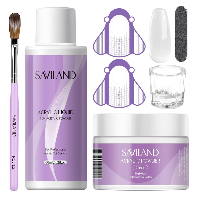 - Acrylic Nail Kit For Beginners: SAVILAND acrylic nail kit contains 30g clear acrylic nail powder, 60 ml acrylic liquid, 1pc acrylic nail brush (size 12), and 10pcs nail forms, and 1pc nail file to meet the nail art needs, includes everything you need to get started acrylic nail art or DIY at home, take a try!