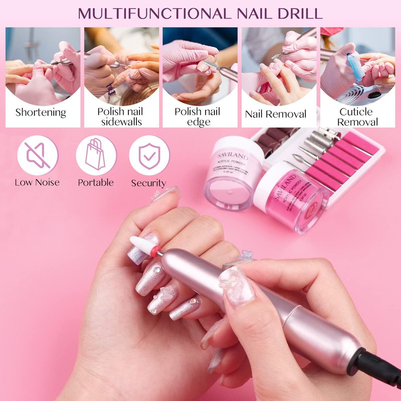 - All-in-1 Nails Kit Acrylic Set with Nail Drill: SAVILAND nail kit acrylic set comes with 3pcs stylish and classic acrylic powder(clear/white/pink), an electric nail drill machine set, 1*50ml acrylic liquid, 1*glass dappen dish, 1*acid-free PH bond, 1*no wipe top coat, acrylic nail brush (#8/10/12) with different functions, 2pcs basic nail tools (nail file and buffer) and 100pcs nail forms to meet your nail art needs. Everything you need to get started acrylic nail art are included