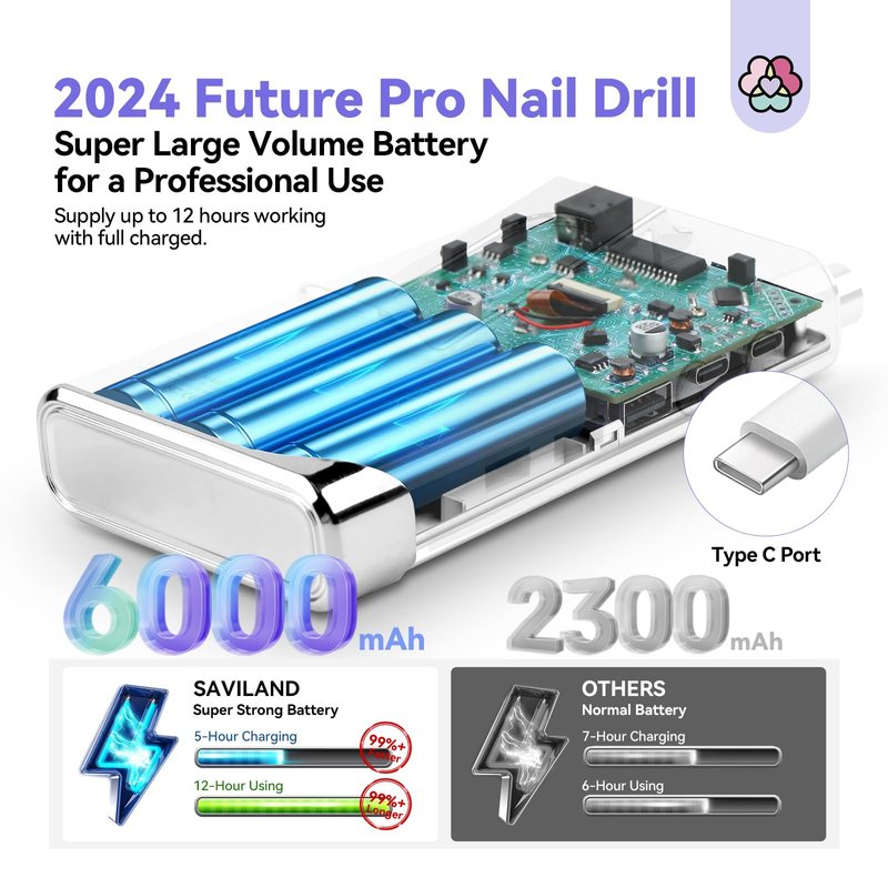 SAVILAND Electric Nail Drill Professional: 2024 Pro Future Tech 40000RPM Nail Drill Kit E File for Acrylic Nails Gel Polish Rechargeable 6000mAh Portable Nail Filer Drill Bits Salon Manicure Pedicure