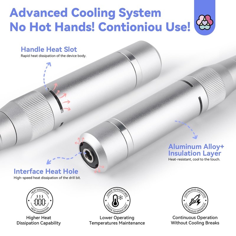 High-capacity batteries in nail drills ensure continuous and smooth operation, improving efficiency and precision. With a full charge time of 3.5 hours, they provide up to 10 hours of usage. Ideal for extended and uninterrupted nail art sessions, especially in outdoor or power-limited environments.