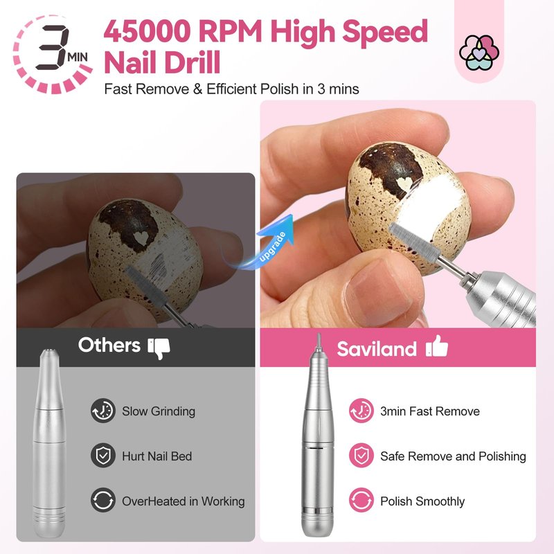 - Fast & Efficient Nail Removal: SAVILAND 2024 PRO electric nail drill can save more time through high performance, it is capable of removing the thickest acrylic and gel nails in just 3 minutes. Advanced MOSFET technology ensures quick and precise nail filing, making it superior to traditional manual methods.