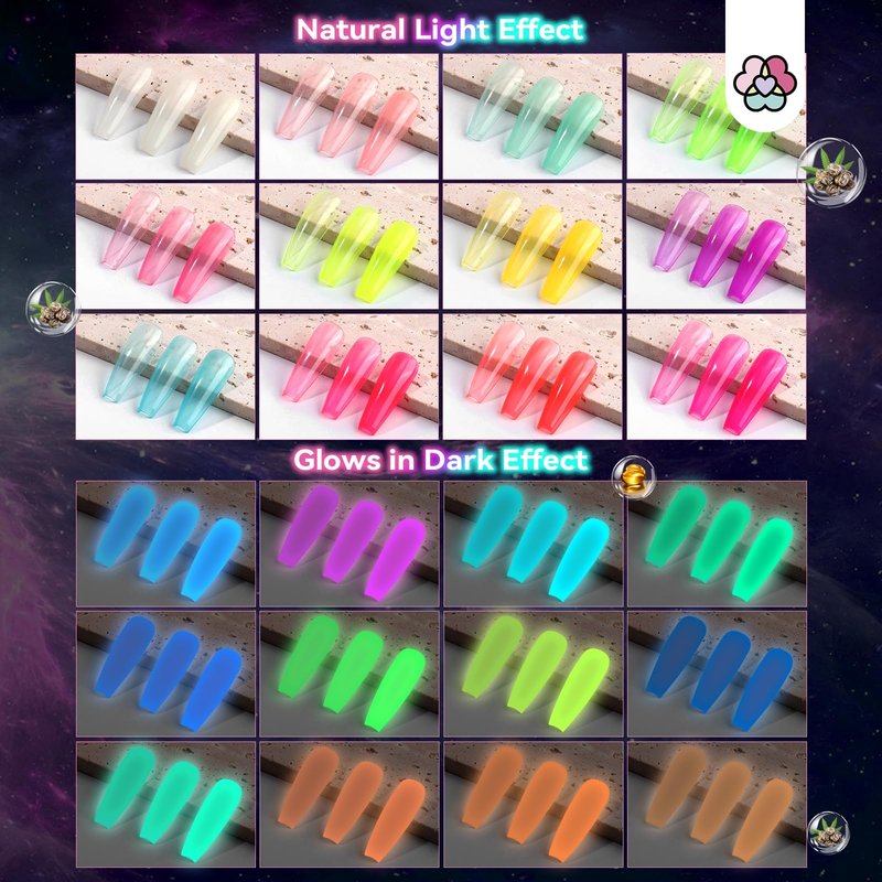 - Glows in the Dark Nail Polish Set: 12 colors* neon luminous nail polish kit, 1* base polish coat,1* top coat. This systematic quick dry nail polish experience comes in an exquisite packaging present box, making it the ideal choice for female or male friends, a great present for weddings,Halloween,Valentine's Day, Christmas, parties, masquerades, etc