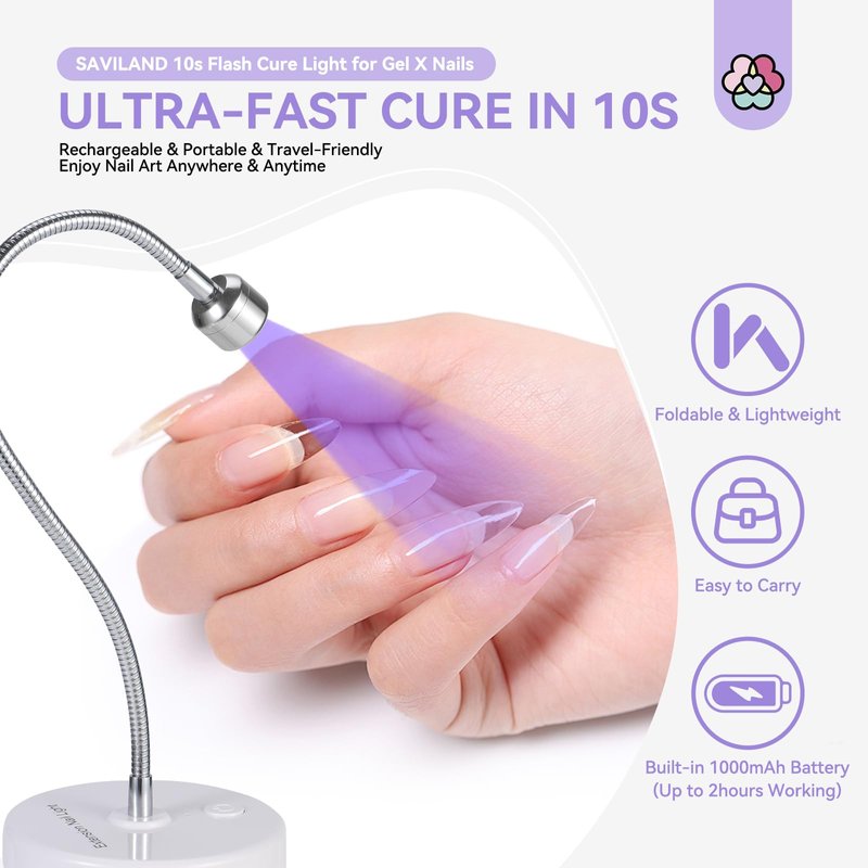 1. Featuring high-quality 365nm + 405nm light beads and 5x magnifying focused technology, SAVILAND U V Nail Lamp ensures concentrated light for even and fast 10 second flash curing. Achieve professional quality nails at home or travelling. 2. Enjoy unparalleled flexibility with our gooseneck U V lamp for Gel X Nails. Its cordless design allows for 360° rotation, ensuring you can cure your nails from any angle with no blind areas. 3. Equipped with a powerful 1000mAh battery, it charges fully in just 1 hour can work up to 2hours. Perfect for traveling or at-home use, you won’t have to worry about power cords or frequent recharging. 4. Achieve salon-quality Gel X Nails Tips, Acrylic, and Polygel at home effortlessly with SAVILAND Nail Cure Lamp. 5. Simplicity meets efficiency with our easy one-touch switch. The LED Nail Lamp features a default 60-second timer setting, making it incredibly user-friendly.