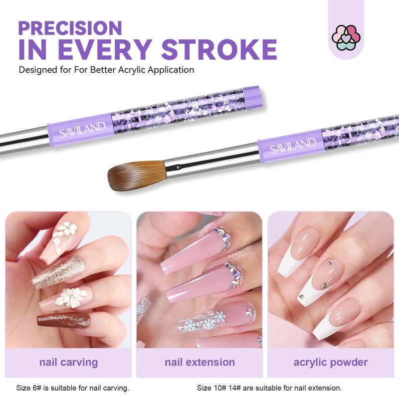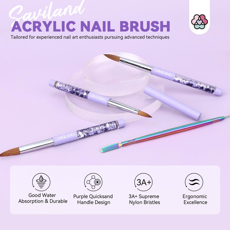 - Professional Acrylic Brush Set: SAVILAND acrylic nail brush set be well-equipped with 3 purple elegant handle acrylic brushes and 1 cleaning comb tool. The premium-quality bristles and thickened aluminum tube ensure durability and protection for the brushes. These brushes offer good flexibility and excellent acrylic powder-carrying, making them suitable for acrylic application. It is a comprehensive set for those starting out in acrylic nail art
