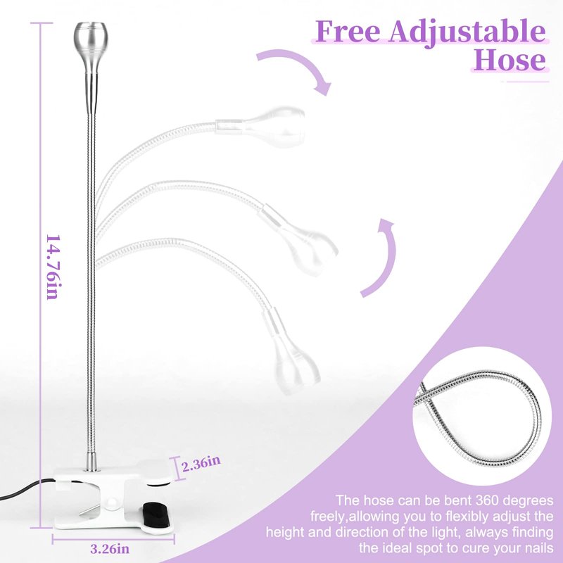 USB powered gel nail light with 3W LED lamp beads,wavelength: 395,Also equipped with a control switch, adjust 4 blighteness levels,easy to use. Flexible Curing Lamp The gooseneck of LED small desk lamp ,it can be bent 360 degrees freely.And with securing clip,make sure the operating process is smooth and stable. Quick Dry cure light comes will provide adequate light source to shorten the curing time but without hurting your hands, it can fast dry all kinds of manicure gel, flexible, time saving, no glaring and no black hurting on you hand. Can Be Used Anywhere For the flexible clip, it is very suitable for fixing to the bedside table, office desk, laptop desk, headboard, etc. A variety of ways to meet your different need. Application Gel nail lamp used for cell phone circuit board repair,It can also be used for fluorescent agent detection and fluorescent banknotes.