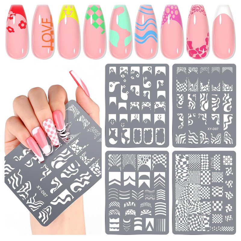 Saviland Nail Art Stamper Plates: 4PCS French Nail Stamping Plates French Line Nail Stamp Templates Plaid Wave Stripes Patterns Nail Stencils Plate Reusable Stainless Steel Nail Tools
