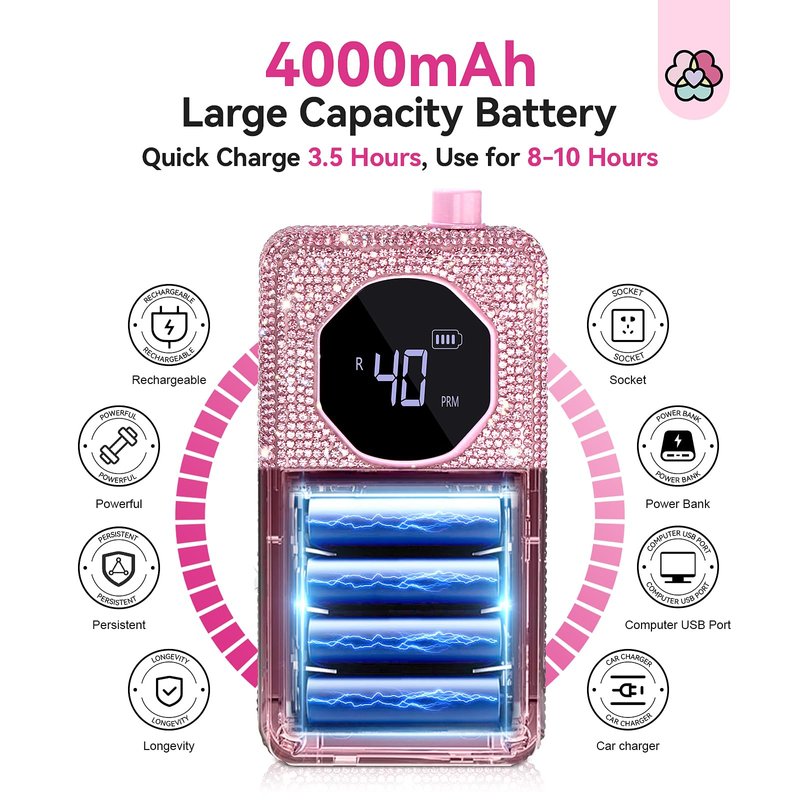 "1. The Electric Nail Drill offers adjustable speeds ranging from 0 to 40000 RPM, allowing for efficient removal of nail art within minutes. 2. The Efile Nail Drill is equipped with 1* nail drill machine, 1* nail drill pen, 1* ceramic needle bit, 1* ceramic cone bit, 1* ceramic cylinder bit, 6* metal drill bits, 5* polishing drill bits, 26* sanding bands, 1* Type-C cable, ensuring a professional manicure experience. 3. The Rechargeable Nail Drill Machine features a 4000mAh battery that need 3.5 hours of charging to provide 8-10 hours of working time. 4. Equipped with a Type-C interface, it can be connected to any Type-C port. 5. The Professional Nail Drill uses three separate buttons, with the LCD screen showing the current status. 6. The Nail Drill stays stable at high speeds, producing minimal heat, noise, and vibration. 7. The Portable Nail Drill includes a clip on the back, allowing for convenient attachment to your waistband.