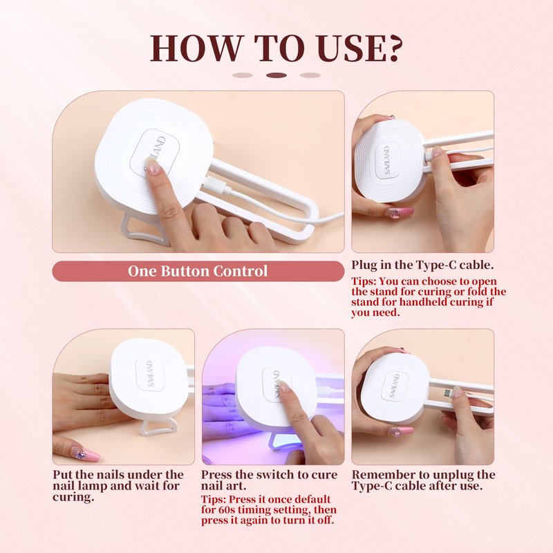 - š ćPORTABLE & EASY TO USE ćSaviland U V light for nails are not only small and lightweight, but they also work great. Nail U V light is a bit larger than a smartphone and can easily fit in a carry-on bag. One key control, The default timing of the U V LED nail lamp is 60s, and it will automatically turn off after 60s. Press it again to turn it off. Let you complete your nail art creation simply and easily.