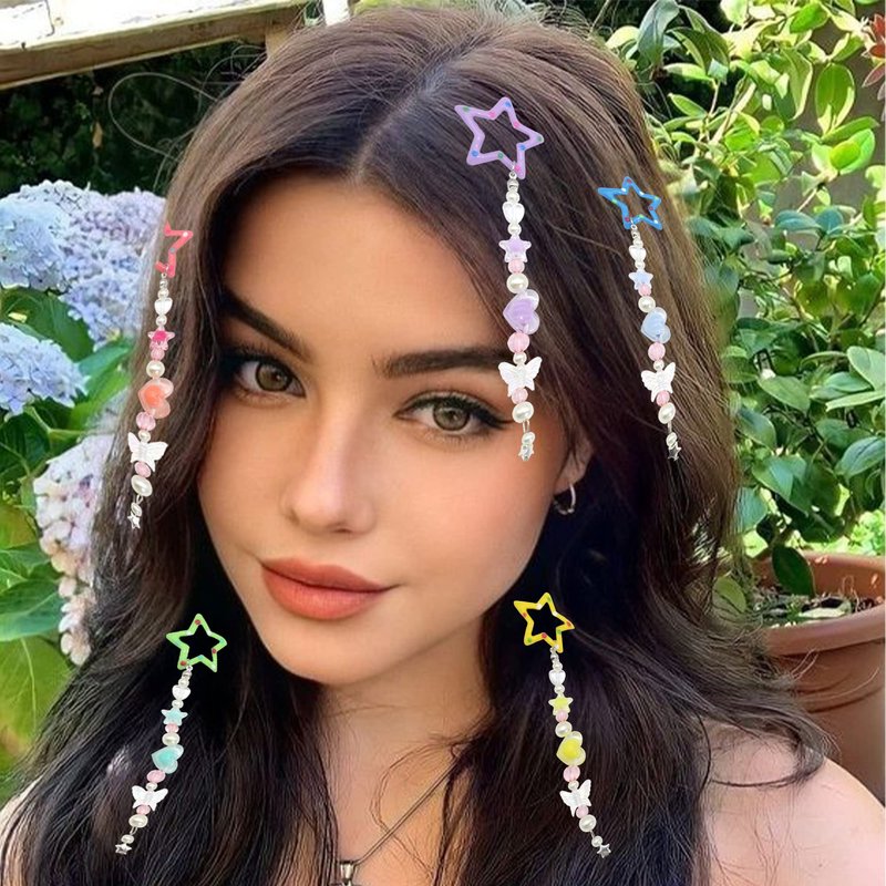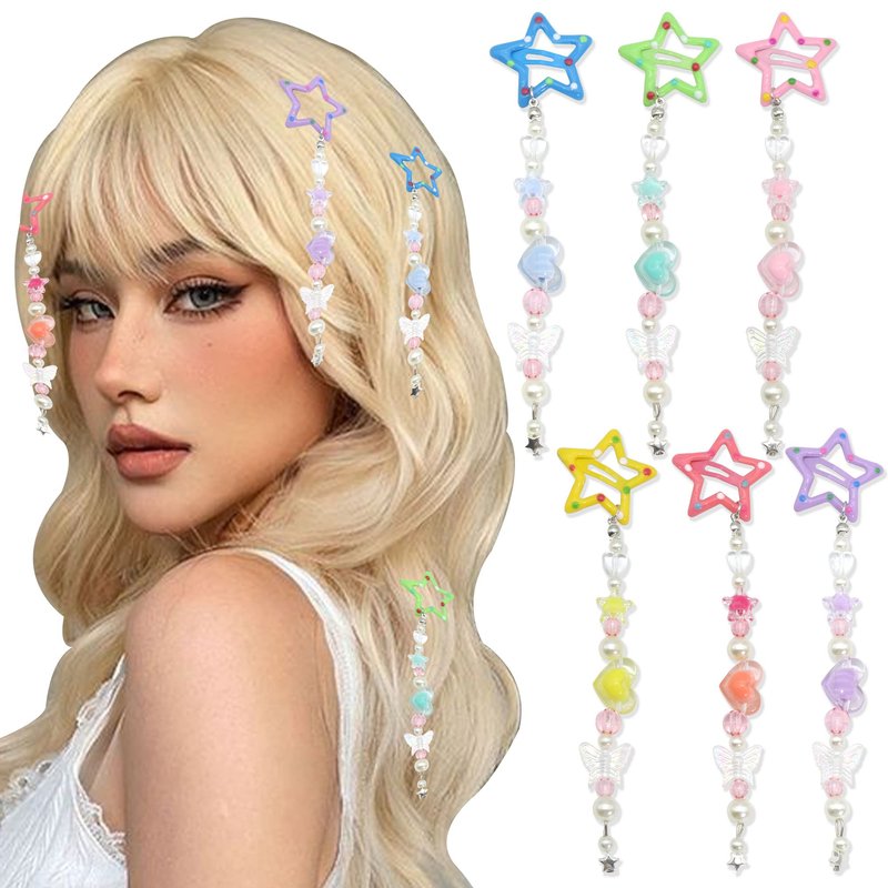 SAWINDA Star Hair Clips 6 Pack - Cute Butterfly Pearl Beaded Pendant Hair Jewelry - Non-Slip Star Hair Accessories - Hair Pins for Women and Girls