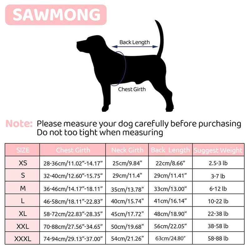 XS: Chest Girth: 11.02"-14.17"/28-36cm, Back Length: 8.66"/22 cm, Suggest Weight: 2.5-3 lb