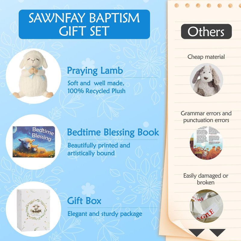 - 💗【Perfect Baptism Gifts For Boys】- The Sawnfay Baptism Gift Set is perfect for boys and newborn babies on their special day of baptism, dedication, or christening. This thoughtfully curated gift set includes a 7" praying lamb plush toy and a bedtime blessing book, all beautifully packaged in a keepsake gift box.