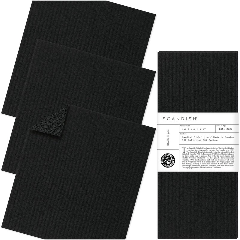 SCANDISH - SET OF 3 BLACK SWEDISH DISHCLOTHS Feel the difference of the Swedish dish towel high absorbing and cleaning power with the Set of 3 Black Swedish Dishcloths for Kitchen. The Swedish cloth is a kitchen wipes reusable cloth that conveniently replaces paper towels and microfiber cloths by providing better absorbency and no odor. THE EARTH-FRIENDLY DISH CLOTH Wash dishes with the dish cloths Swedish design and do it in an effective and earth-conscious way. The authentic made-in-Sweden towel is made of 70% Cellulose (from FCS forests) and 30% Cotton and dyed with Global Organic Textile Standard-approved color. This makes the Swedish dishwashing cloth a natural, biodegradable, and compostable product, suitable for sustainable lifestyles. Perfect if you are looking for biodegradable sponges, rugs, and dishcloths Swedish towels. EASY CARE. REUSABLE The clear black towel dishcloths are easy to use and maintain. Simply wash, wring and air dry. You can also disinfect (boil and soak) and thoroughly clean them in the washing machine. Their authentic material composition is fading-resistant and durable allowing for long-term use. MADE IN SWEDEN Like all SCANDISH products, these dishcloths are designed and made in Sweden blending tradition and high-quality production standards.