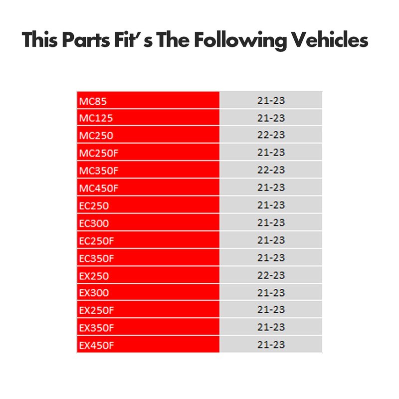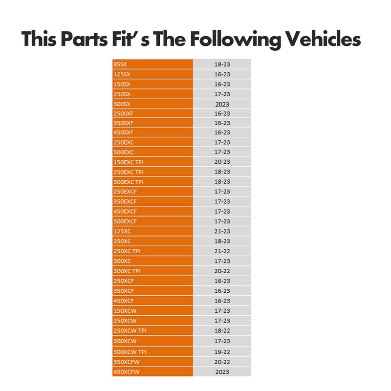 - Compatible with KTM 85SX TE250i (2018 - 2024) / 125SX - 150SX (2016 - 2024) / 250SX (2017 - 2024) / 250SXF - 350SXF - 450SXF (2016 - 2024) / 250EXCF - 350EXCF - 450EXCF - 500EXCF (2017 - 2024) / 250EXC (2017 - 2024) / 300EXC (2017 - 2024) / 150EXC TPI (2020 - 2024) / 250EXC TPI 300EXC TPI (2018 - 2024) / 300XC TPI (2020-2022) / 300XCW TPI (2019-2022) / 350XCFW (2020-2022).