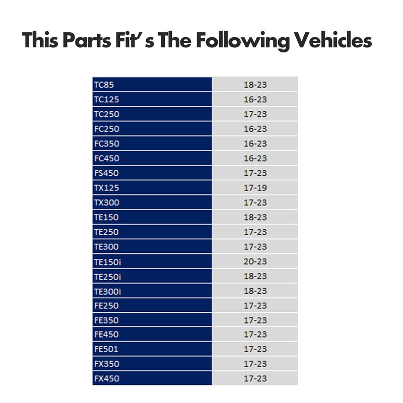 - Compatible with HUSQVARNA TC85 TE150 TE250i (2018 - 2024) / TC125 FC250 - FC350 - FC450 (2016 - 2024) / TC250 FS450 TE250 TE300 FE250 FE350 FE450 FE501 FX350 FX450 TX300 (2017-2024) / TX125 (2017 - 2019) / TE150i (2020-2024) /