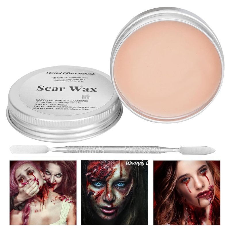- Fake Molding Wound Skin Scar Wax Kit --- Easy to shape to any realistic looks you can imagine.Scars and gashes,cuts,bullet holes,big wounds,bites,burns,blisters,fast lips,broken nose,bumps,torn face,prosthetics makeup,zombie makeup and any kinds of special effect sfx make up you want.The color of the wax is nearly the same to the human skin,matched and kind to most of skin tones.It seems like you have injured but just need some moment to finish that and to scar your friends.