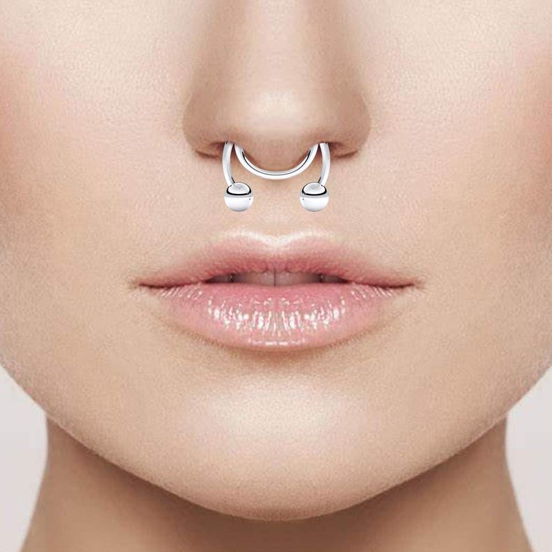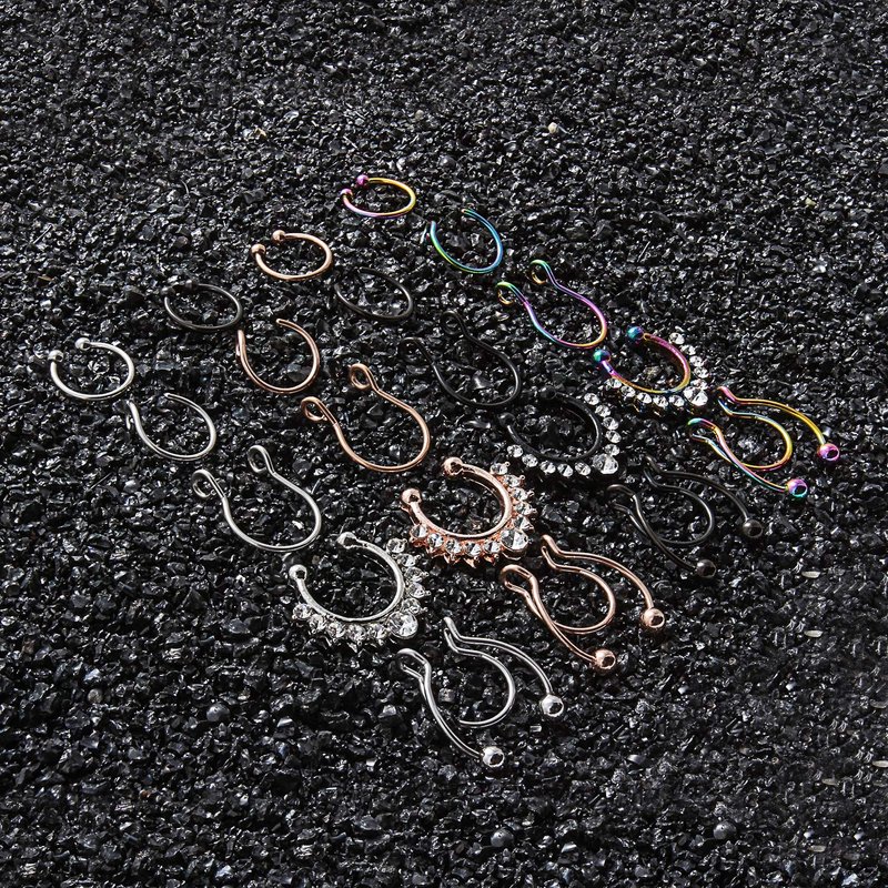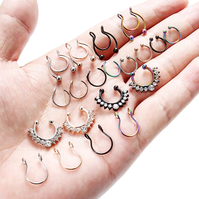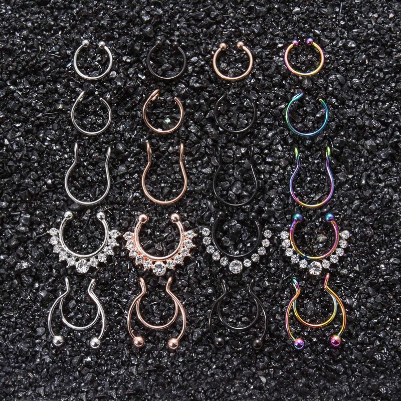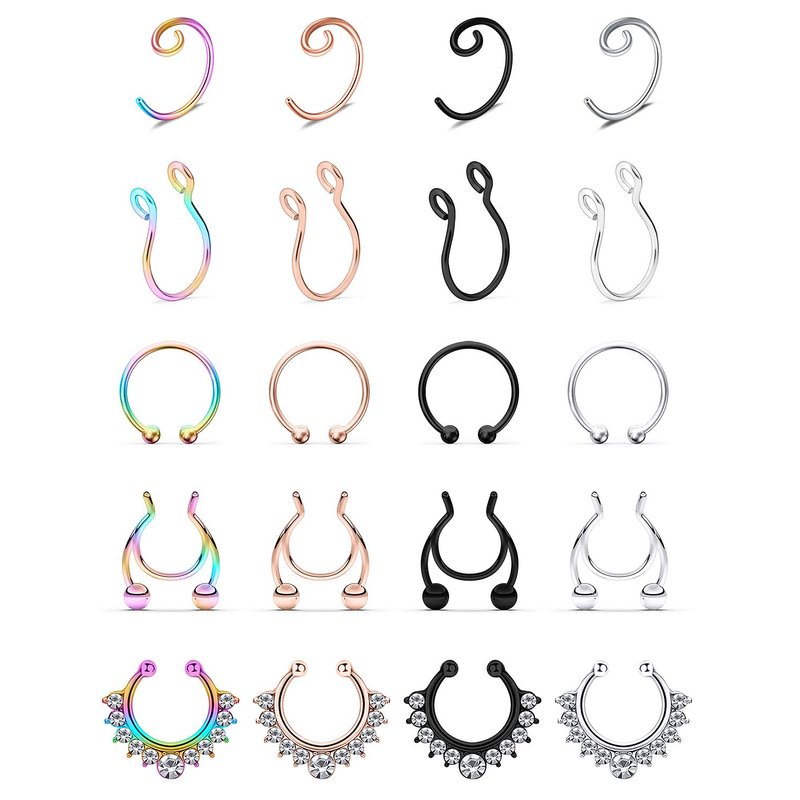- Includes 20PCS fake septum clip on non piercing jewelry nose hoop rings in 5 styles,mix-styles(each style four pieces) give you mutiply wearring outfit, reasonable price for body lewelry,deserve to purchase.Thye are good to use as Nose ring, Lip ring ,Helix earrings ,Cartilage earrings, Tragus Ear piercing,earrings and septum ring.