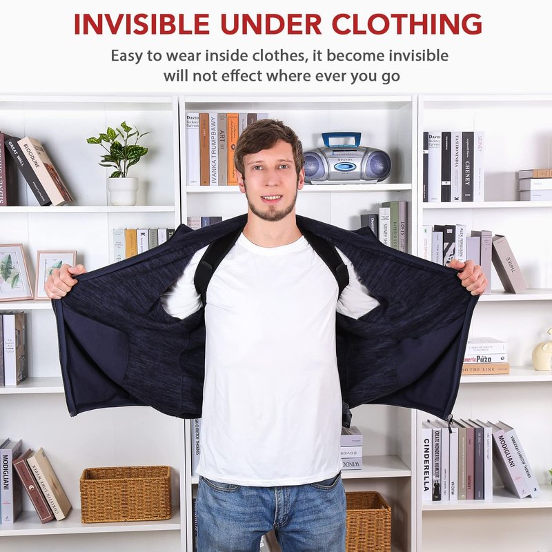 - Invisible under clothes: This back brace can be worn under the clothes. It is undetectable and very comfortable so that you will forget it after a while. Notes: If you feel discomfort, loosen the straps and readjust. The buckle pad on the back can be adjusted as needed. If you experience numbness, swelling, or discoloration, discontinue use immediately.