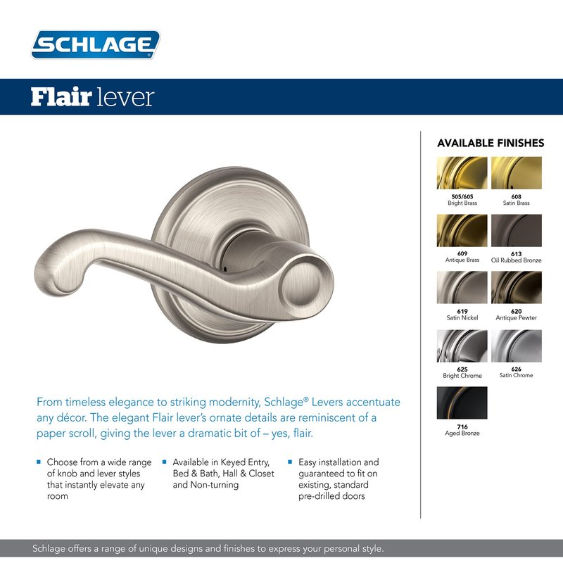 Schlage F40 V FLA 609 Flair Door Lever, Bed & Bath Privacy Lock, Antique Brass