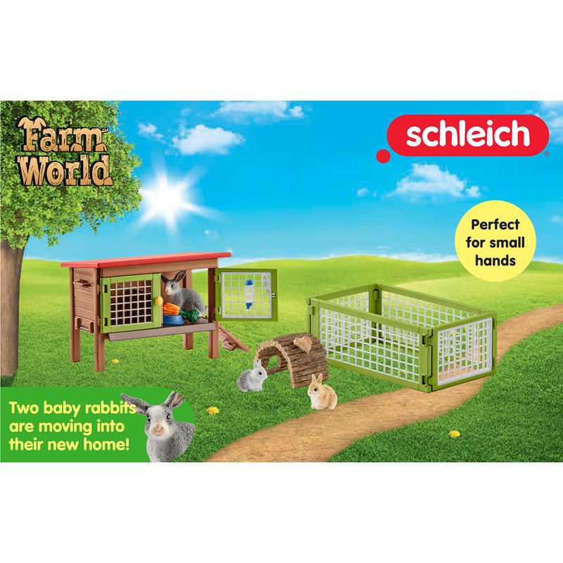 - PART OF A GROWING PLAY WORLD. The Rabbit hutch is part of the Farm World collection of figurines and playsets from Schleich. Great for gifting, this playset can stand alone or fit into a larger, modular play world. The Farm World Vet Practice with Pets is an excellent accompaniment.