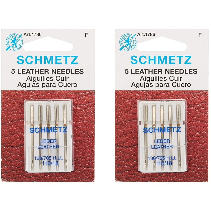 EURO NOTIONS-Schmetz: Leather Needles. This package contains five sewing machine needles designed specifically for use with leather, artificial leather, and heavy non-woven synthetic fabrics. They are all size 110/18 and have a cutting point. Imported.