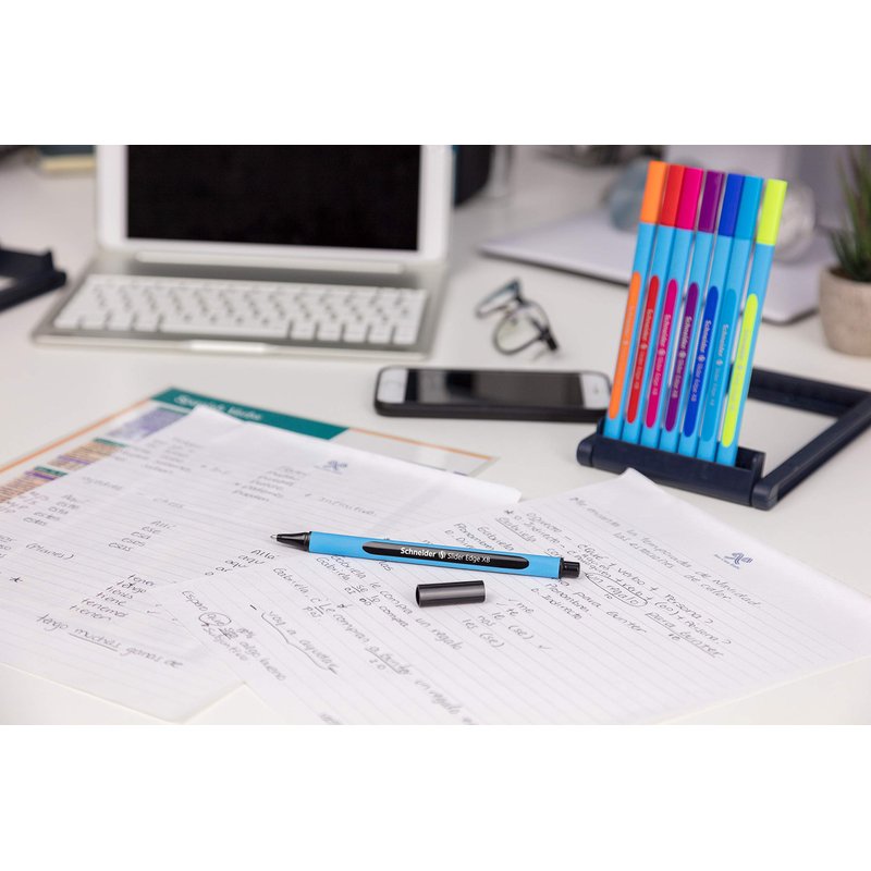 Schneider Slider Edge XB (Extra Broad) Ballpoint Pen, 1.4 mm, Light Blue Barrel, Assorted Ink Colors, Adjustable Case Stand of 8 Pens (152279)