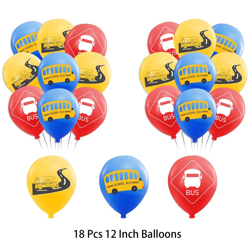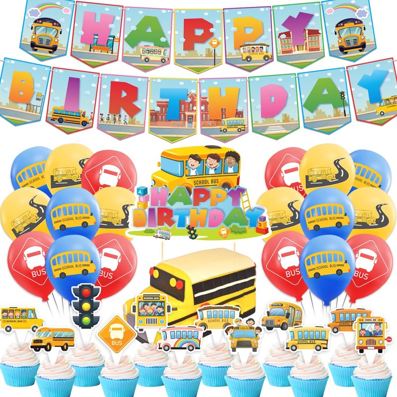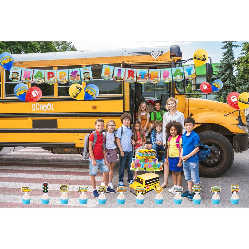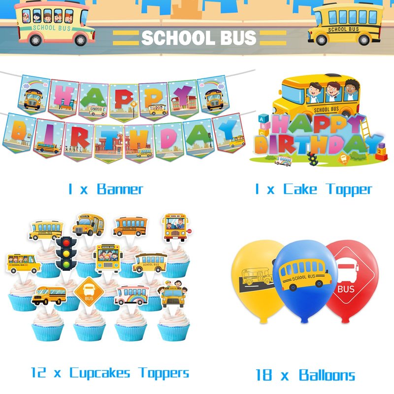 - School Bus Party Supplies: Package includes 1* school bus happy birthday banner, 1* school bus cake topper, 12* school bus cupcake toppers, 18* school bus balloons,1 ribbon. Suitable for school bus decorations.